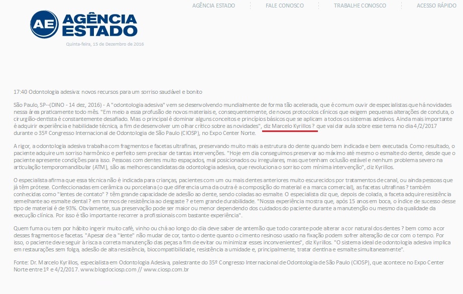 Clipping AGÊNCIA ESTADO (SITE) - Odontologia adesiva: novos recursos para um sorriso saudável e bonito 15/12/2016