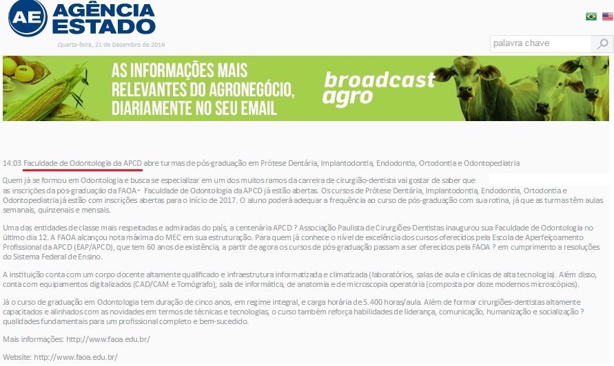 AGÊNCIA ESTADO - Faculdade de Odontologia da APCD lança cursos de pós-graduação