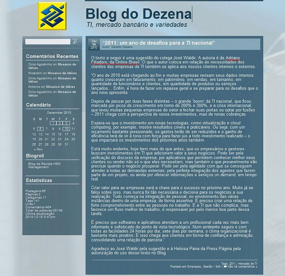 Clipping BLOG DO DEZENA (VICE-PRESIDENTE DE TI / BANCO DO BRASIL) - Perspectivas para 2011 13/12/2010
