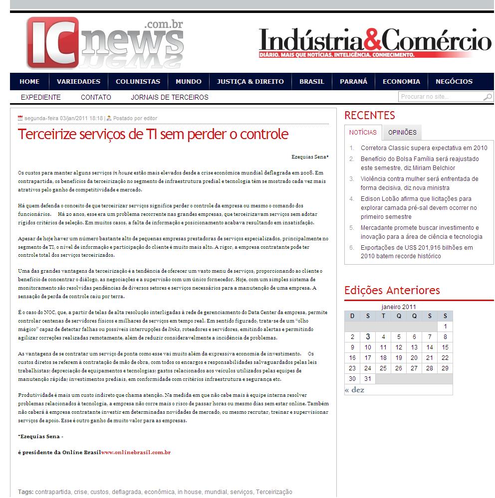 Clipping JORNAL INDÚSTRIA E COMÉRCIO (ONLINE/PR) - Terceirize serviços de TI sem perder o controle 04/01/2011