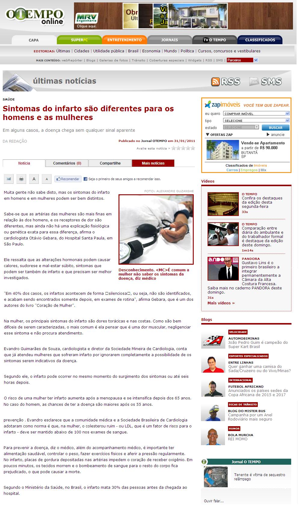 Clipping JORNAL O TEMPO (IMPRESSO, DIGITAL E ONLINE/MG) - Sintomas do infarto são diferentes para os homens e as mulheres 31/01/2011