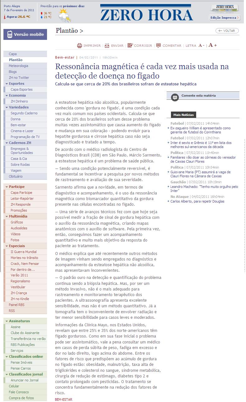 Clipping JORNAL ZERO HORA (ONLINE/RS) - Ressonância magnética é cada vez mais usada na detecção de doença no fígado 07/02/2011