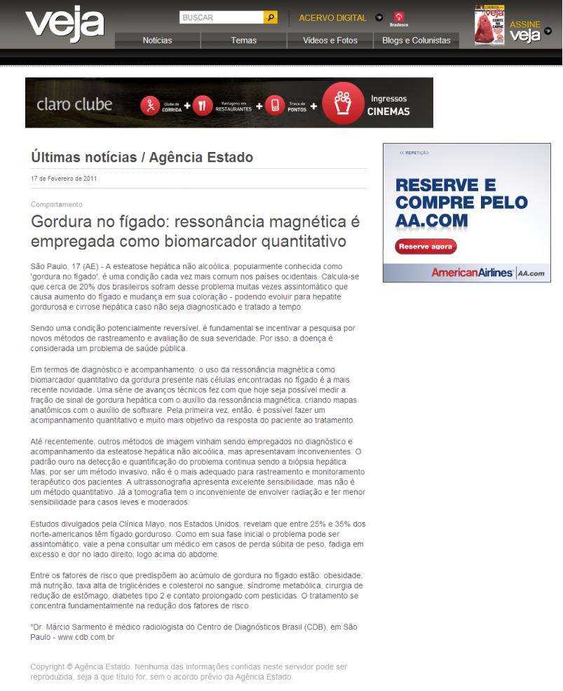 Clipping VEJA (ONLINE) - Gordura no fígado: ressonância magnética é empregada como biomarcador quantitativo 17/02/2011