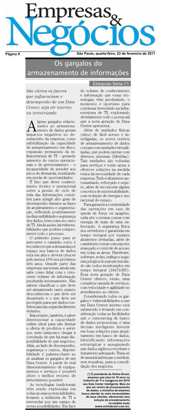 Clipping JORNAL EMPRESAS & NEGÓCIOS (IMPRESSO E DIGITAL) - Os gargalos do armazenamento de informações 23/02/2011