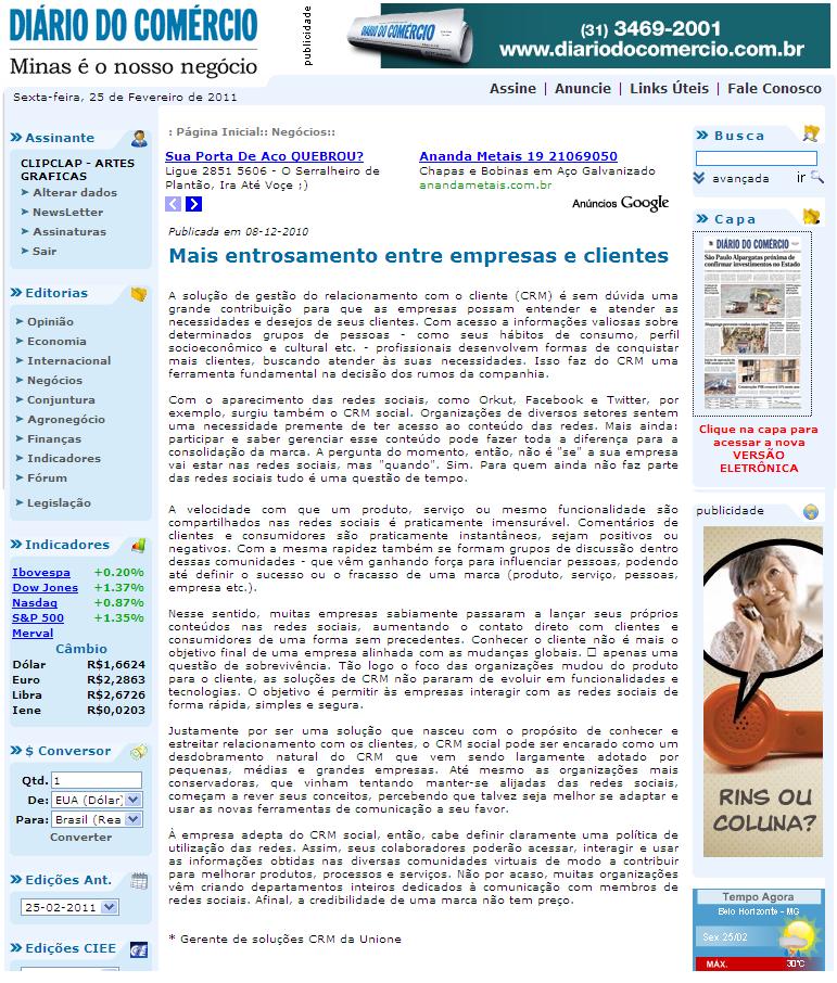 Clipping DIÁRIO DO COMÉRCIO (IMPRESSO, DIGITAL E ONLINE/MG) - Mais entrosamento entre empresas e clientes 25/02/2011