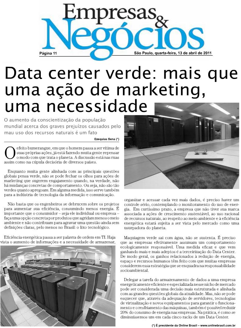 Clipping JORNAL EMPRESAS & NEGÓCIOS (IMPRESSO E DIGITAL) - Data Center verde: mais que uma ação de marketing, uma necessidade 13/04/2011