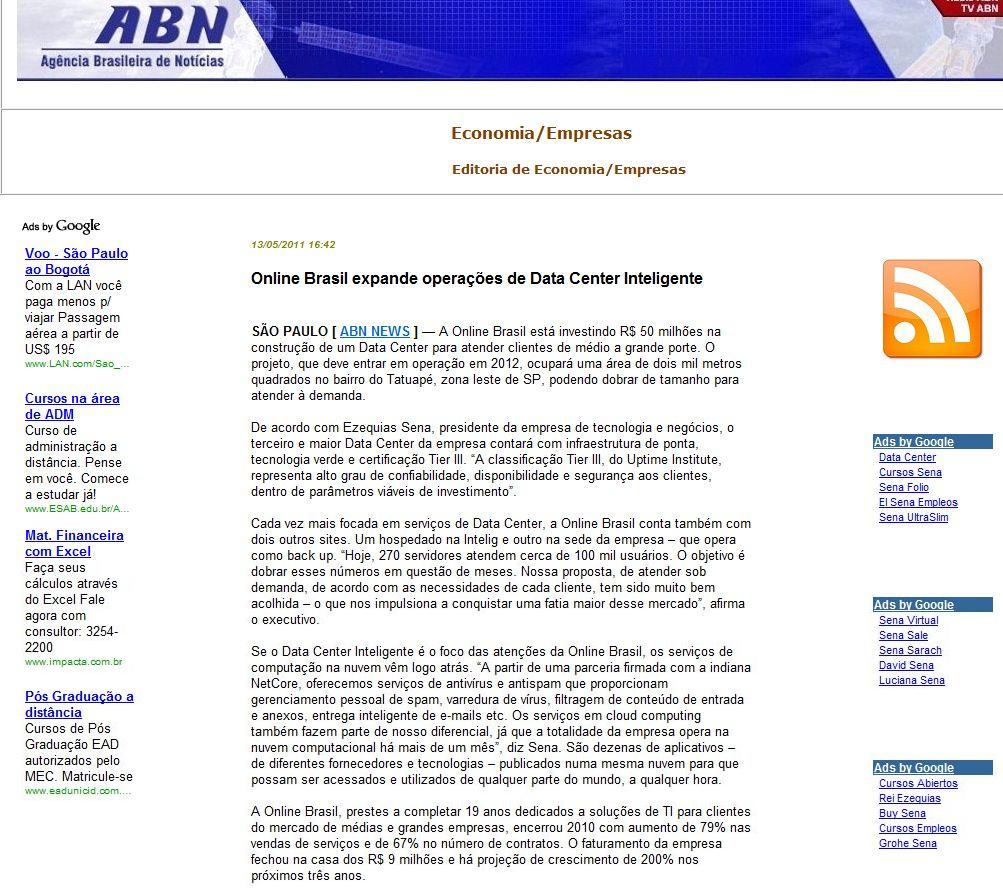 Clipping AGÊNCIA BRASILEIRA DE NOTÍCIAS - Online Brasil expande operações de Data Center Inteligente 13/05/2011