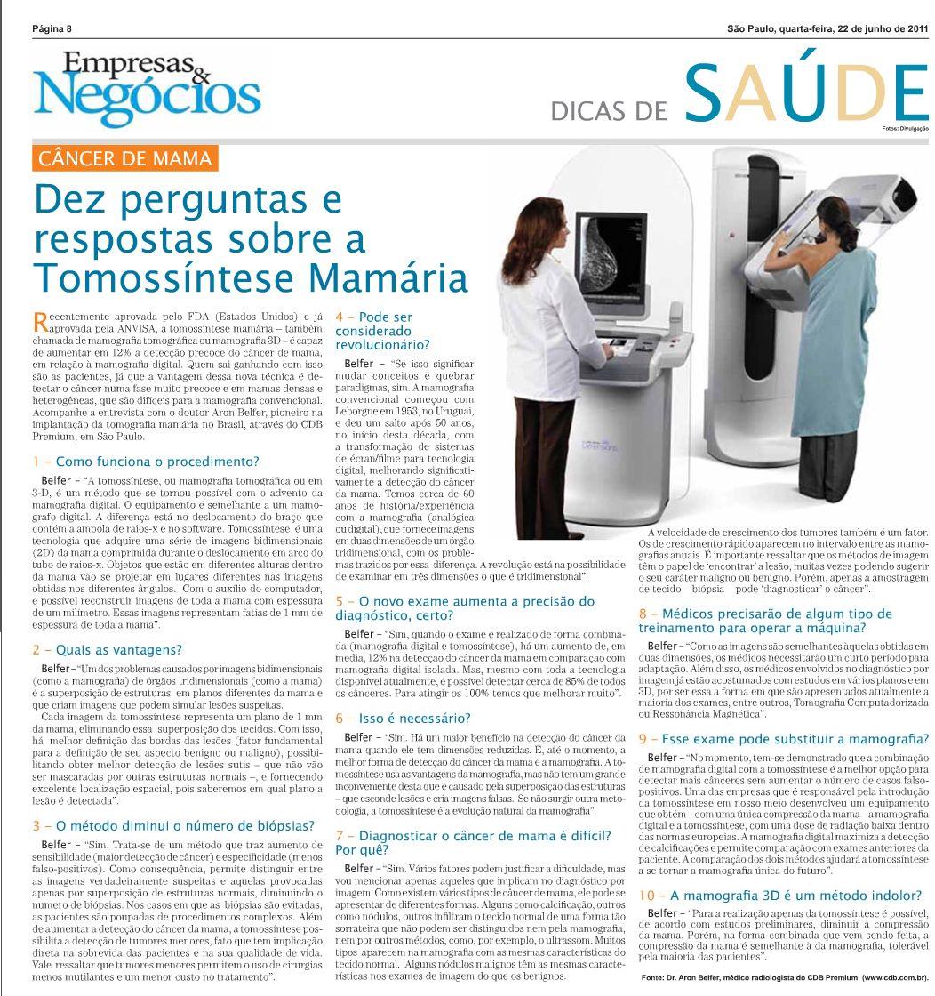 Clipping JORNAL EMPRESAS & NEGÓCIOS - Dez perguntas e respostas sobre a Tomossíntese Mamária 22/06/2011
