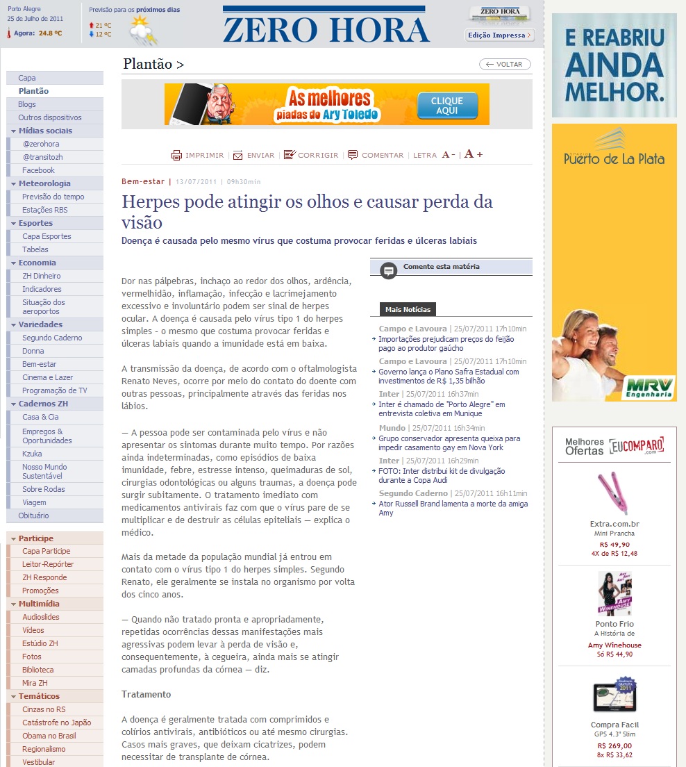 JORNAL ZERO HORA (IMPRESSO/DIGITAL) - Herpes ocular não tem cura