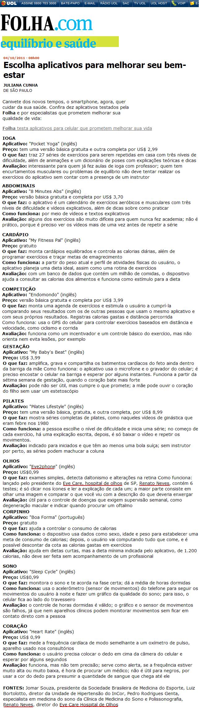 Clipping FOLHA DE S. PAULO ONLINE - Saúde dos olhos tem novo aplicativo para iPhone e iPad 04/10/2011