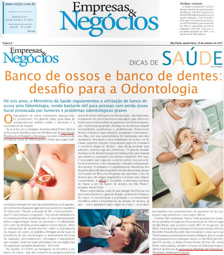 Clipping JORNAL EMPRESAS & NEGÓCIOS - Banco de ossos e banco de dentes: desafio para a Odontologia brasileira 19/10/2011