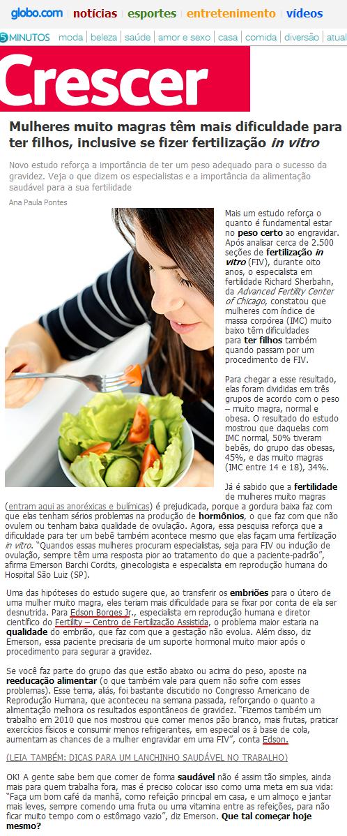 Clipping CRESCER ONLINE - Mulheres muito magras têm mais dificuldades para ter filhos, inclusive se fizer fertilização in vitro 28/10/2011
