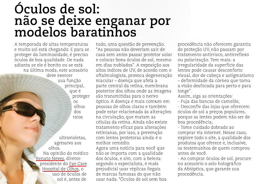 Clipping REVISTA FREE SP (IMPRESSA E DIGITAL) - Óculos de sol: não se deixe enganar por modelos baratinhos 03/11/2011