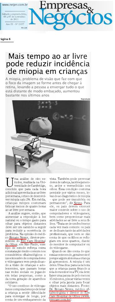 Clipping JORNAL EMPRESAS & NEGÓCIOS - Mais tempo ao ar livre pode reduzir incidência de miopia em crianças e adolescentes 08/11/2011