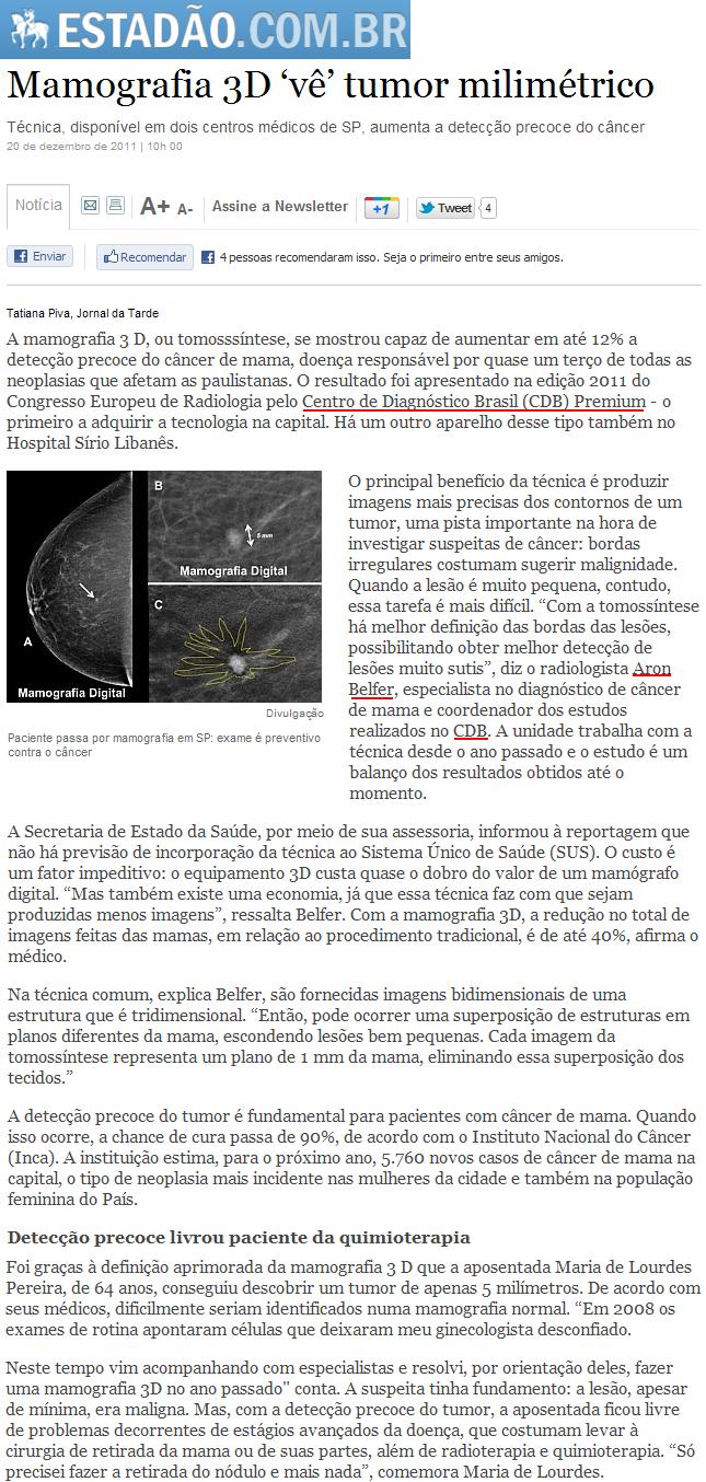 PORTAL ESTADÃO - Mamografia 3D "vê" tumor milimétrico