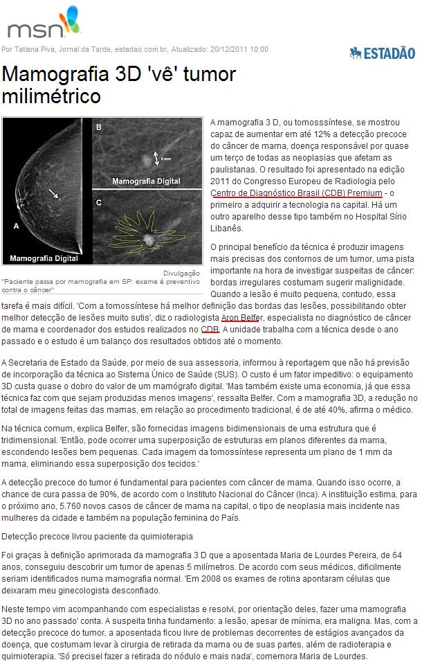 PORTAL MSN - Mamografia 3D vê tumor milimétrico