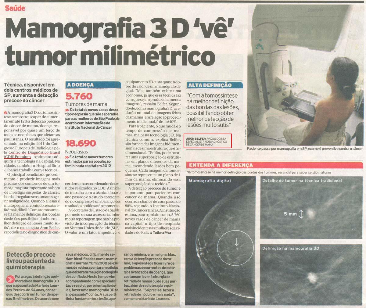 JORNAL DA TARDE - Mamografia 3D "vê" tumor milimétrico