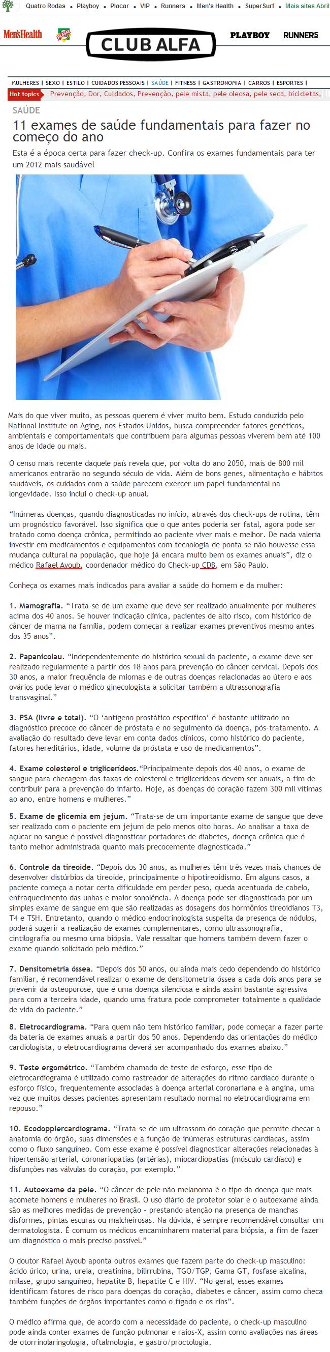 Clipping REVISTA ALFA (PORTAL) - Melhor época para fazer check-up e colocar a saúde em dia 11/01/2012