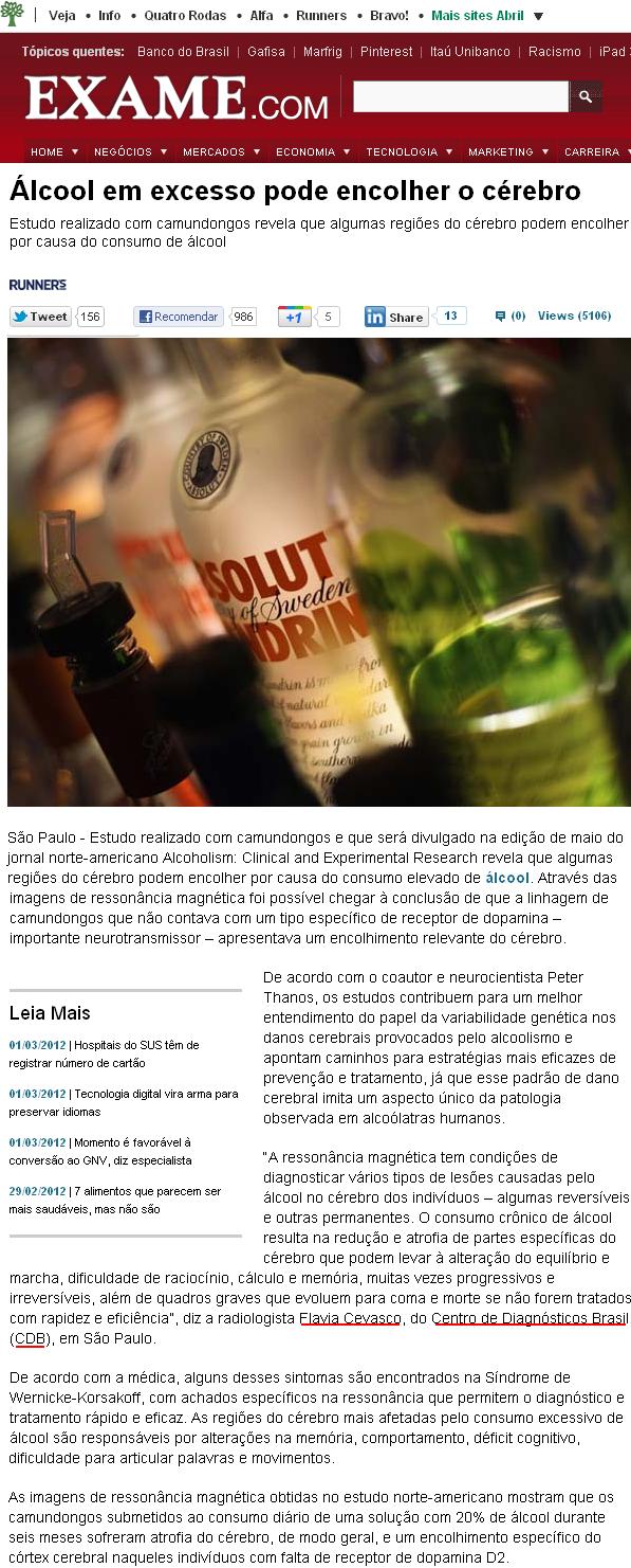 REVISTA EXAME (PORTAL) - Álcool em excesso pode encolher o cérebro, diz estudo