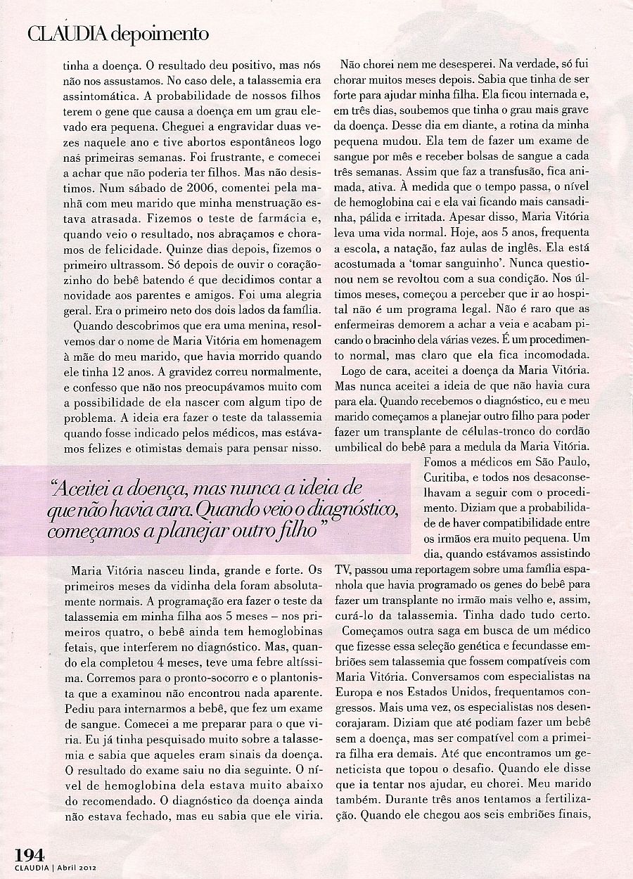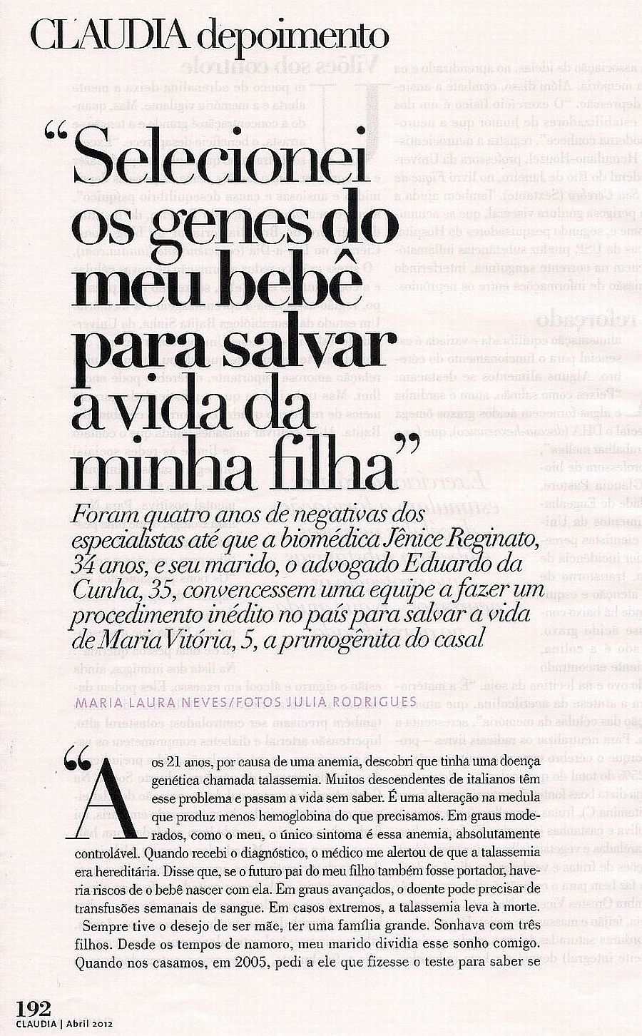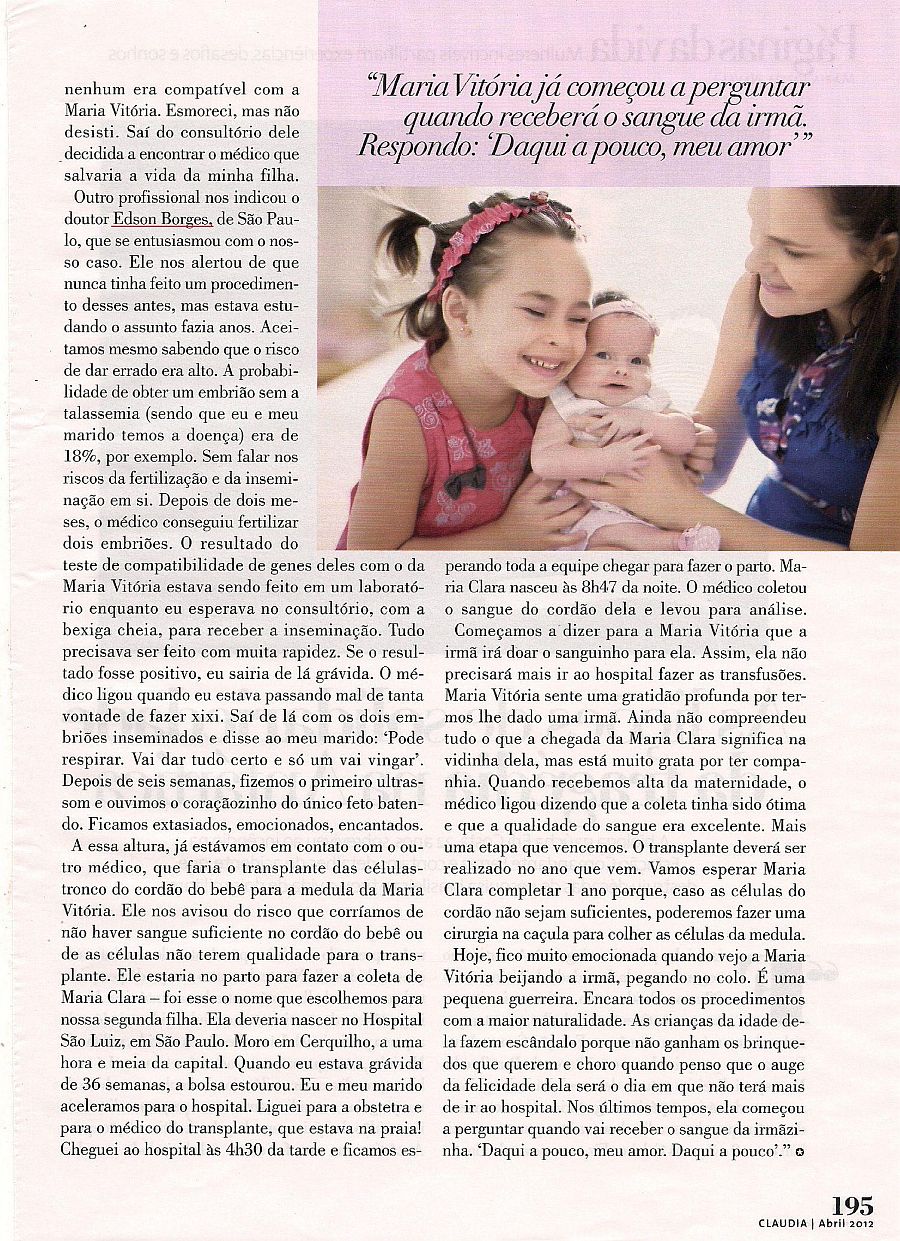 Clipping REVISTA CLAUDIA - "Selecionei os genes do meu bebê para salvar a vida da minha filha" 04/04/2012