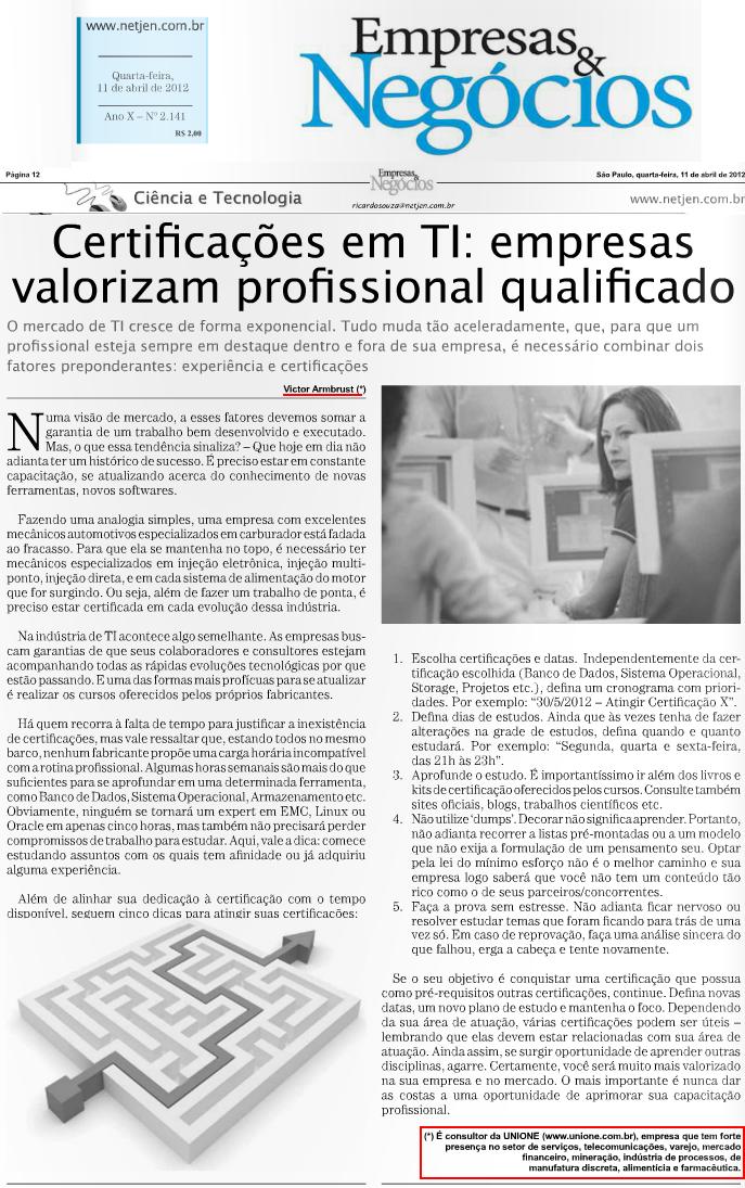 Clipping JORNAL EMPRESAS & NEGÓCIOS - Certificações em TI: empresas valorizam profissional qualificado 11/04/2012