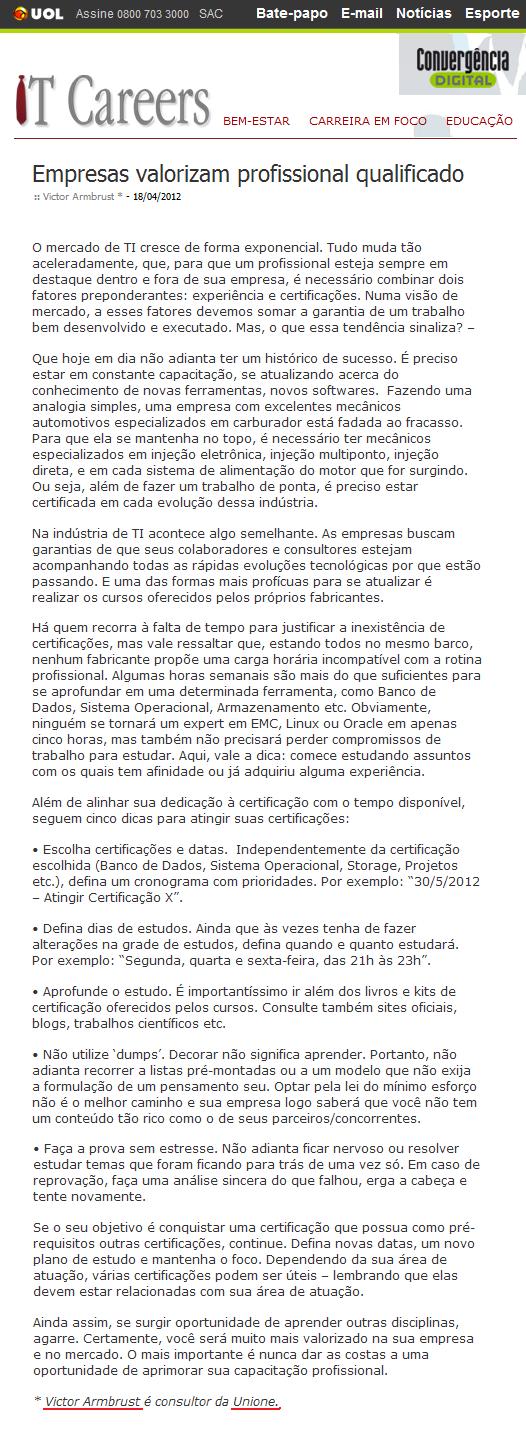 Clipping IT CAREERS (UOL/CONVERGÊNCIA DIGITAL) - Empresas valorizam profissional qualificado 19/04/2012