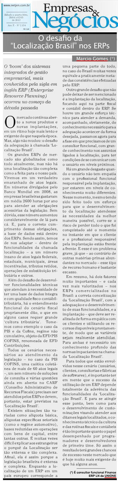 JORNAL EMPRESAS & NEGÓCIOS - O desafio da 'Localização Brasil' nos ERPs