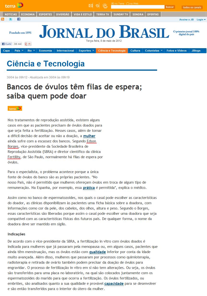 Clipping JORNAL DO BRASIL (TERRA) - Banco de óvulos têm filas de espera; saiba quem pode doar 08/05/2012
