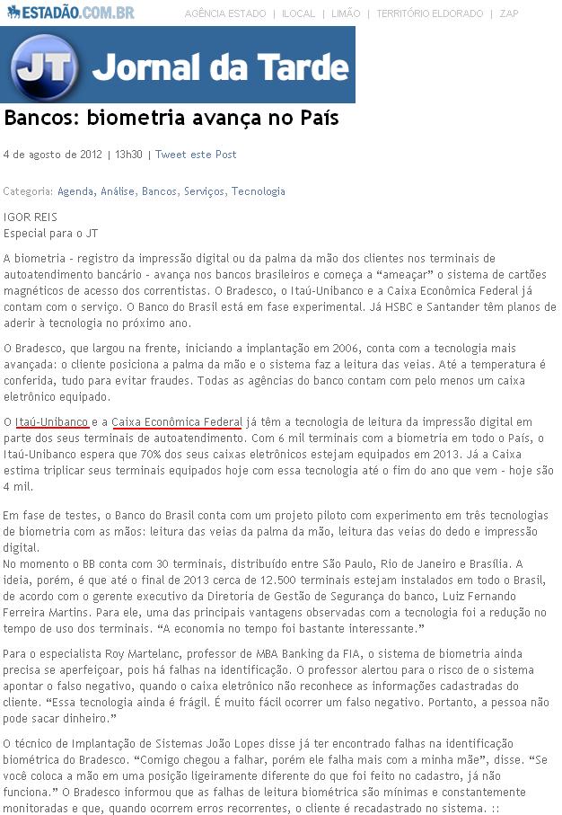 JORNAL DA TARDE (ONLINE) - Bancos: biometria avança no país