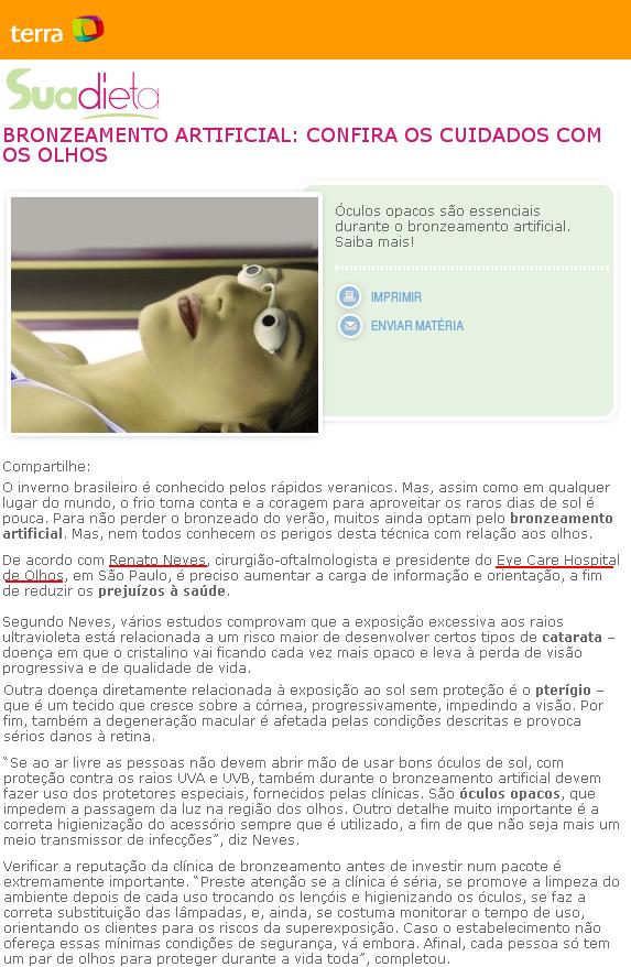 Clipping PORTAL TERRA (SUA DIETA) - Bronzeamento artificial: Confira os cuidados com os olhos 07/08/2012