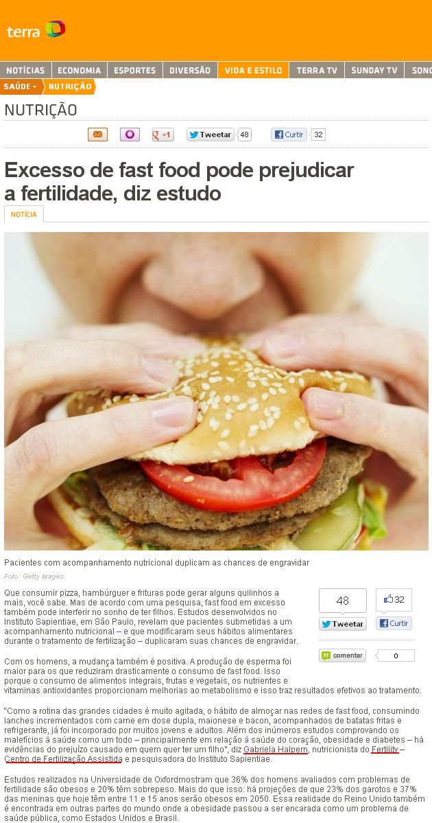 PORTAL TERRA - Excesso de 'fast food' pode comprometer fertilidade