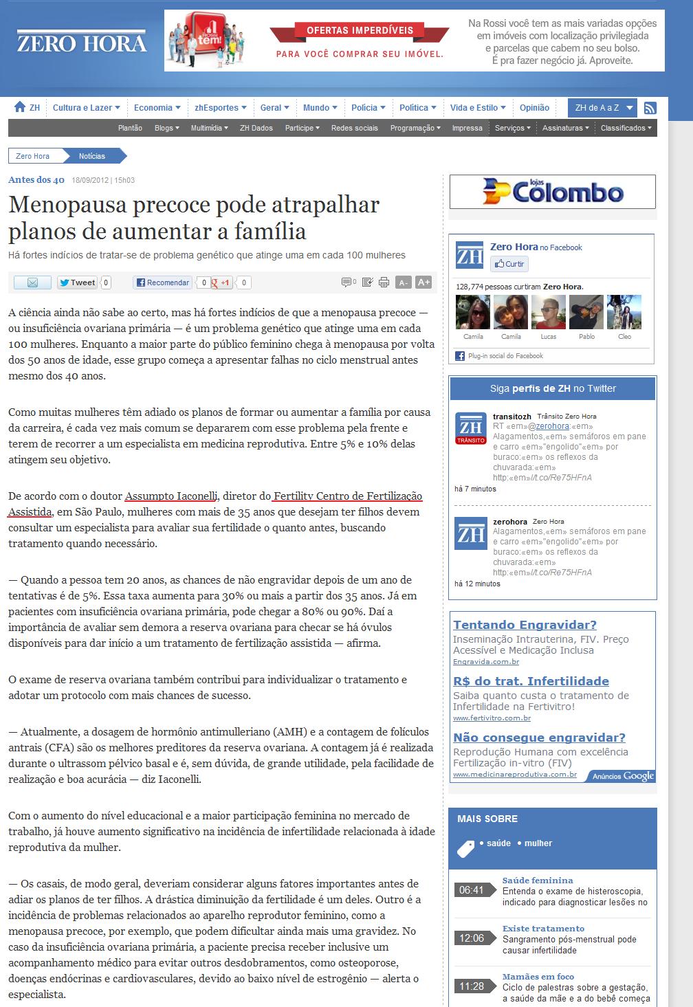 Clipping ZERO HORA (ONLINE) - Menopausa precoce pode atrapalhar planos de aumentar a família 18/09/2012