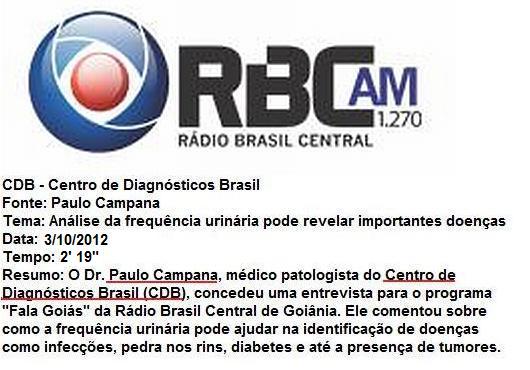 Clipping RÁDIO BRASIL CENTRAL (GO) - Análise da frequência urinária pode revelar importantes doenças 05/10/2012