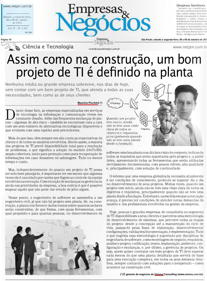 Clipping JORNAL EMPRESAS & NEGÓCIOS (ONLINE) - Assim como na construção, um bom projeto de TI é definido na planta 08/10/2012