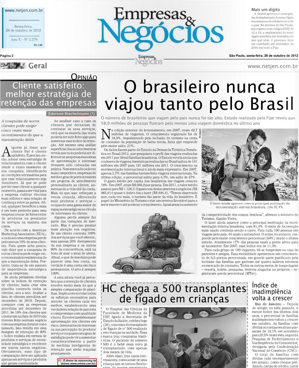Clipping JORNAL EMPRESAS & NEGÓCIOS - Cliente satisfeito: melhor estratégia de retenção das empresas 26/10/2012