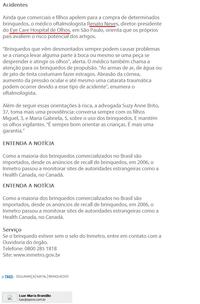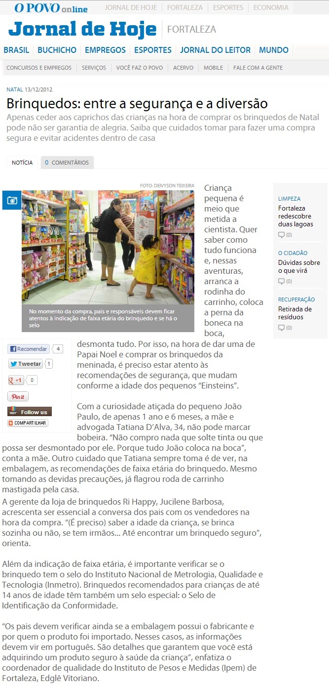 Clipping JORNAL DE HOJE (FORTALEZA - CE) - Neste Natal, escolha presentes seguros para as crianças 13/12/2012
