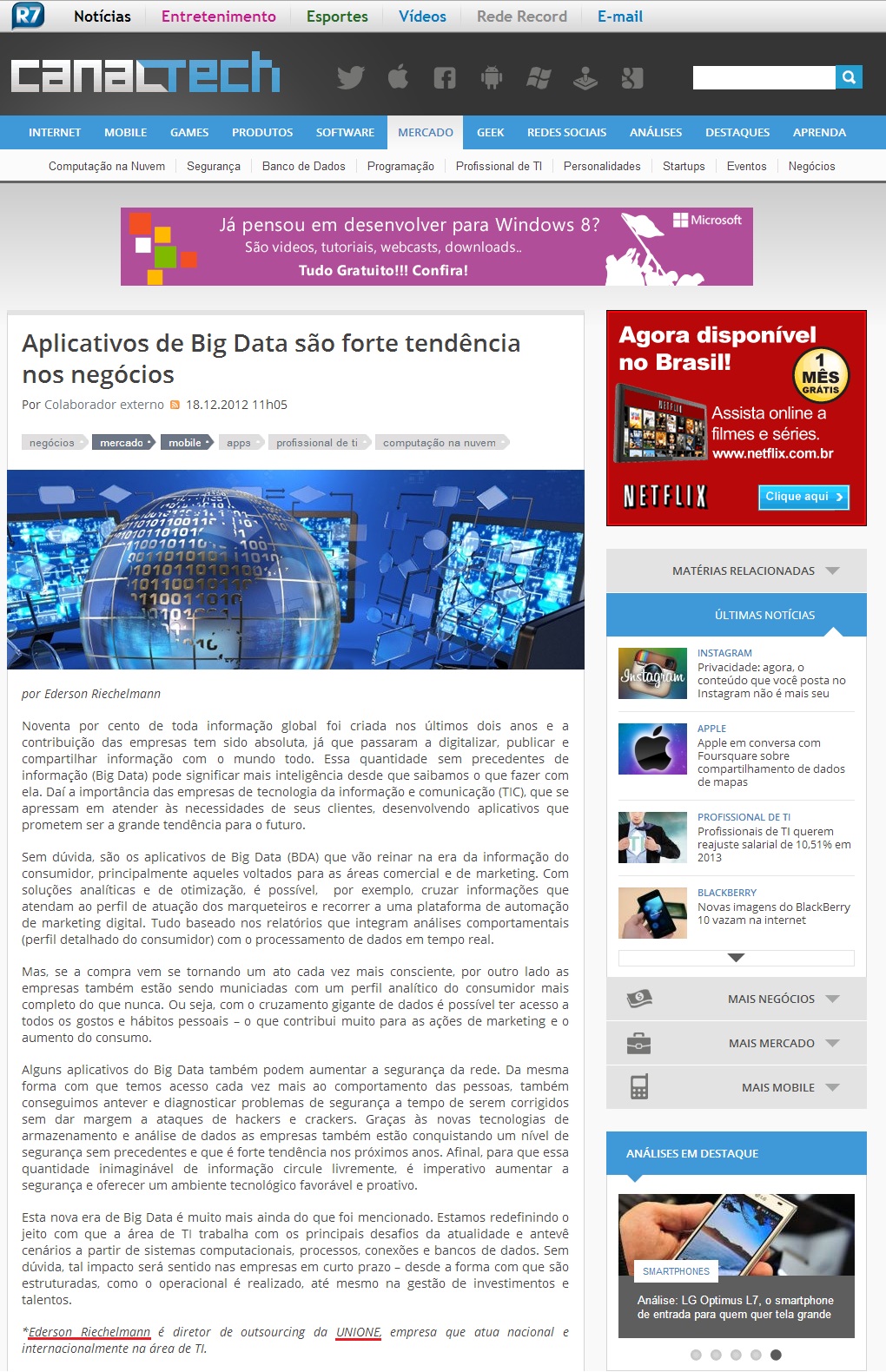Clipping CANAL TECH (PORTAL R7) - Aplicativos de Big Data são forte tendência nos negócios 18/12/2012