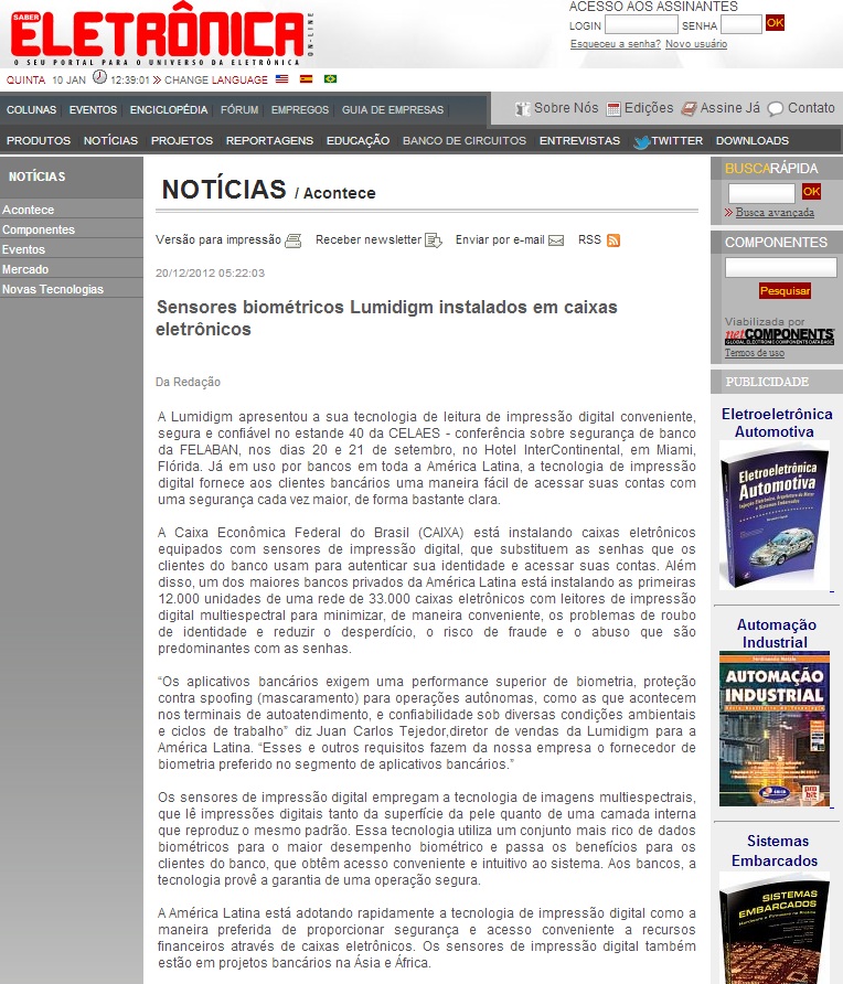 Clipping REVISTA SABER ELETRÔNICA (online) - Sensores biométricos Lumidigm instalados em caixas eletrônicos 10/01/2013