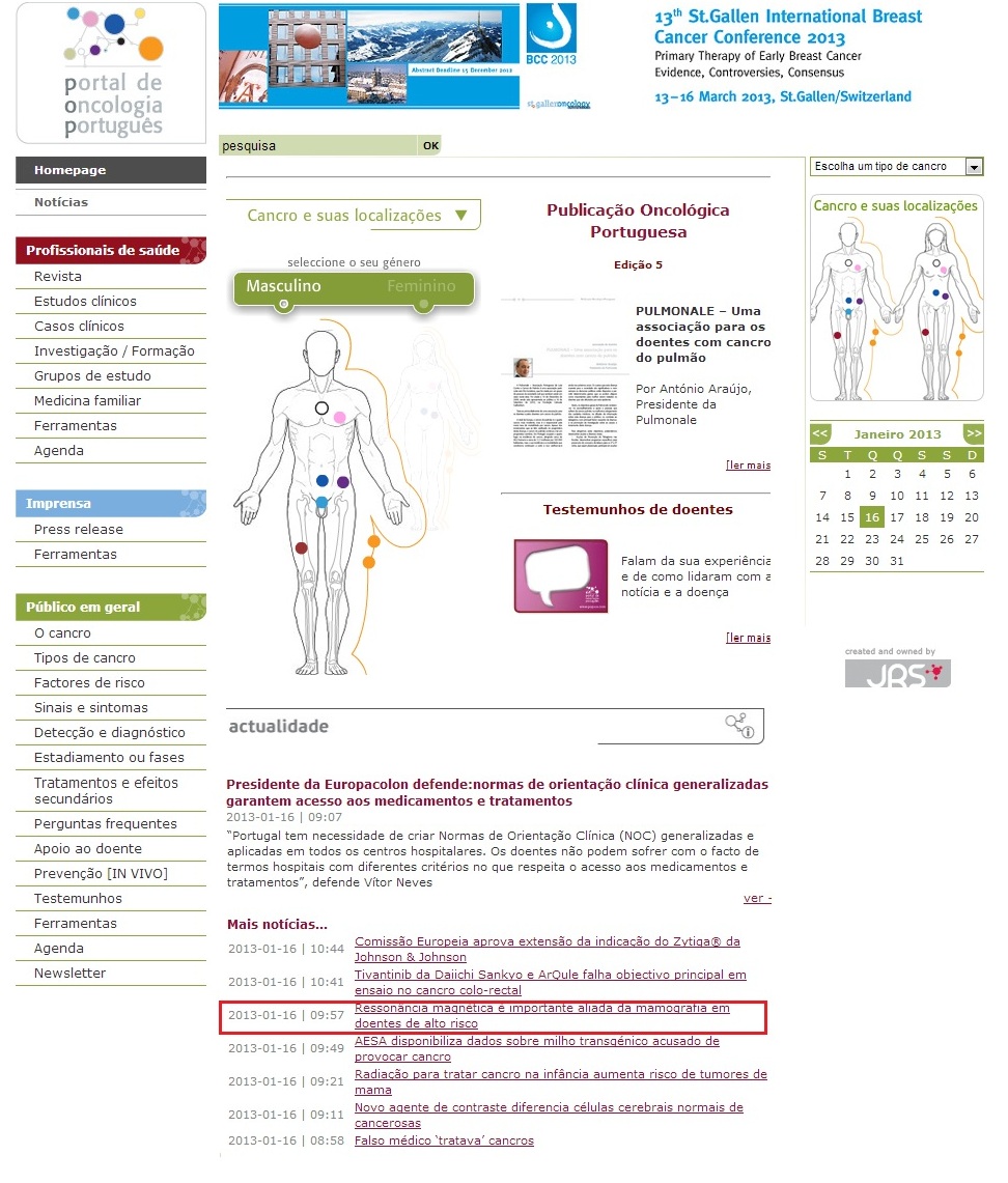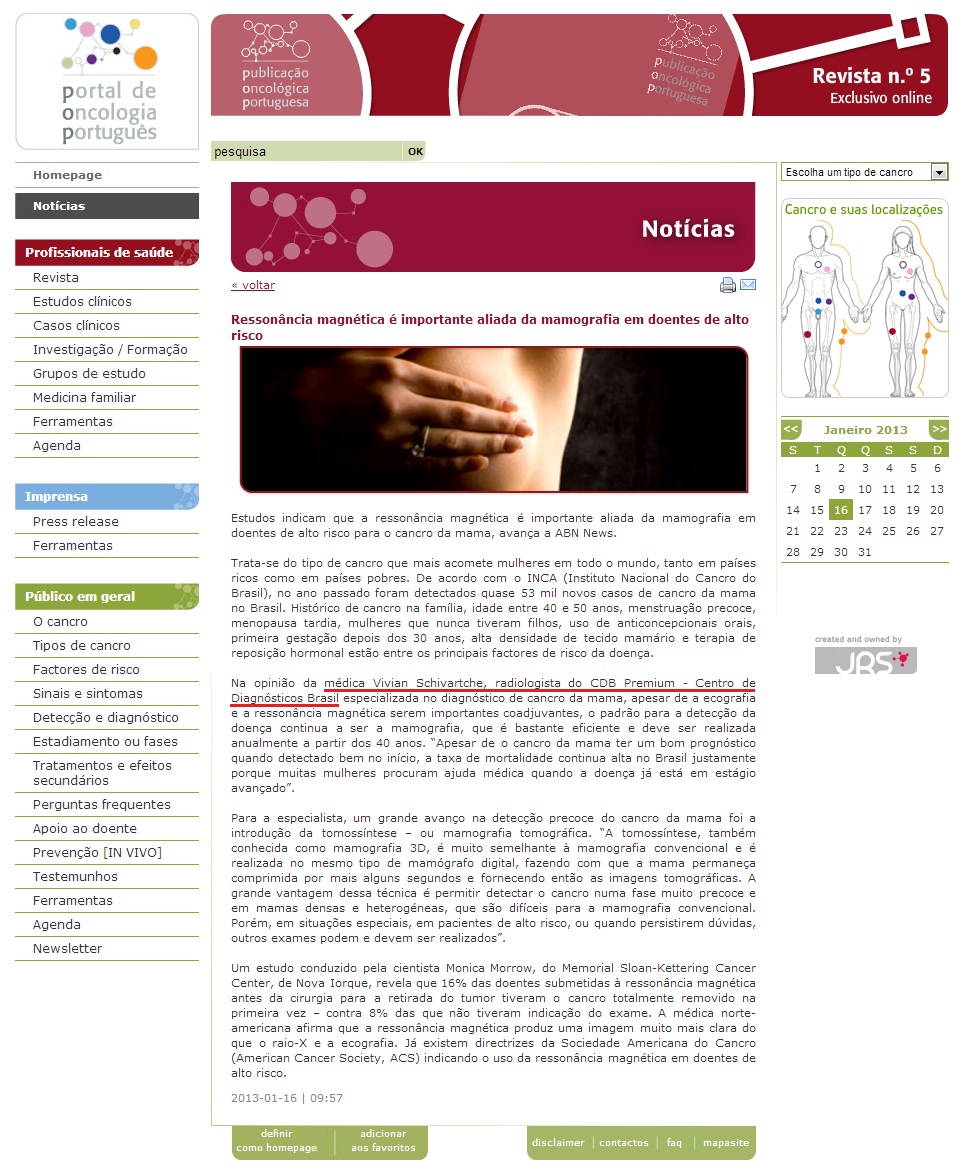 Clipping PORTAL DE ONCOLOGIA PORTUGUÊS (POP) - Ressonância magnética é importante aliada da mamografia em doentes de alto risco 16/01/2013