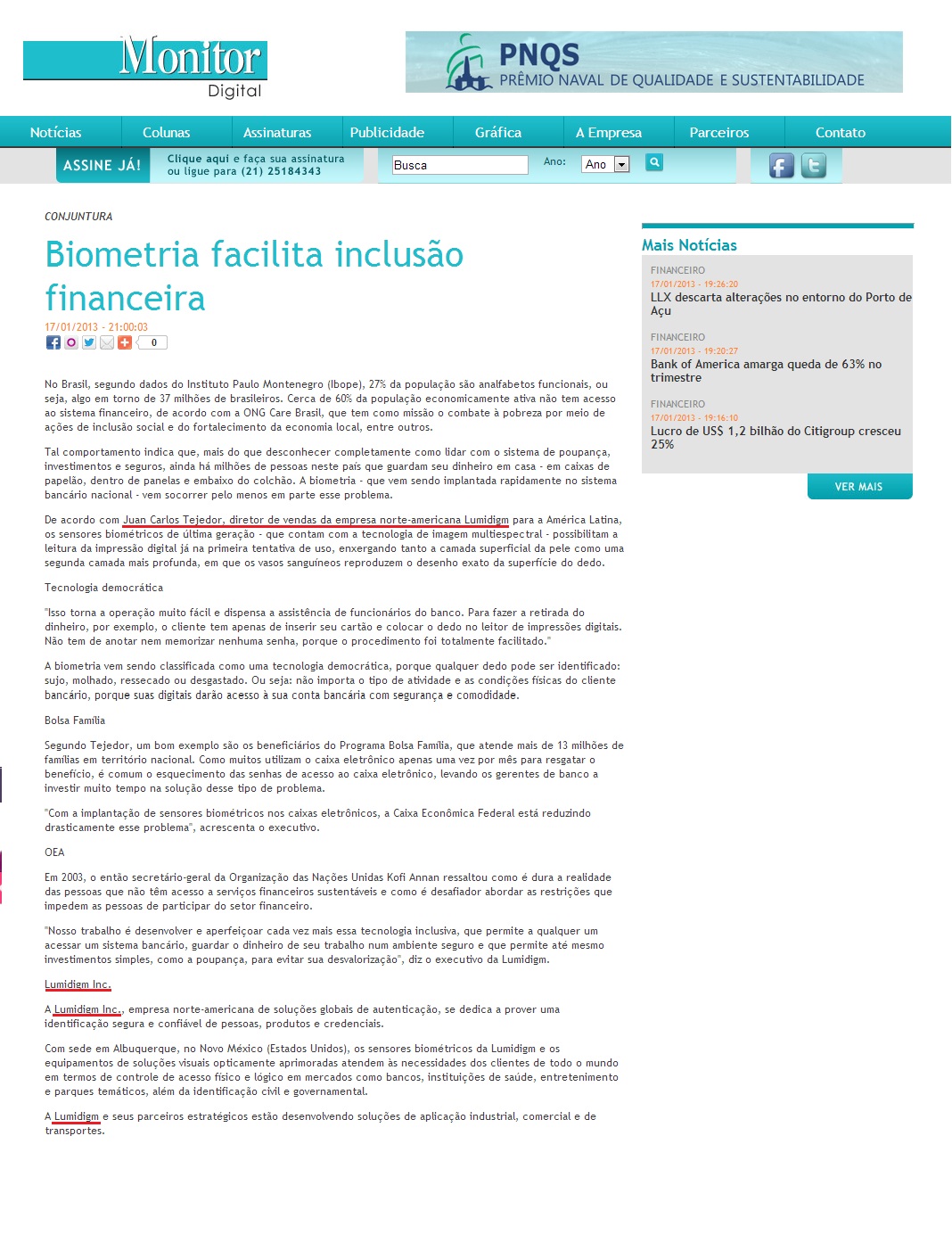 Clipping JORNAL MONITOR MERCANTIL (ONLINE) - Biometria exerce papel fundamental na inclusão financeira 18/01/2013