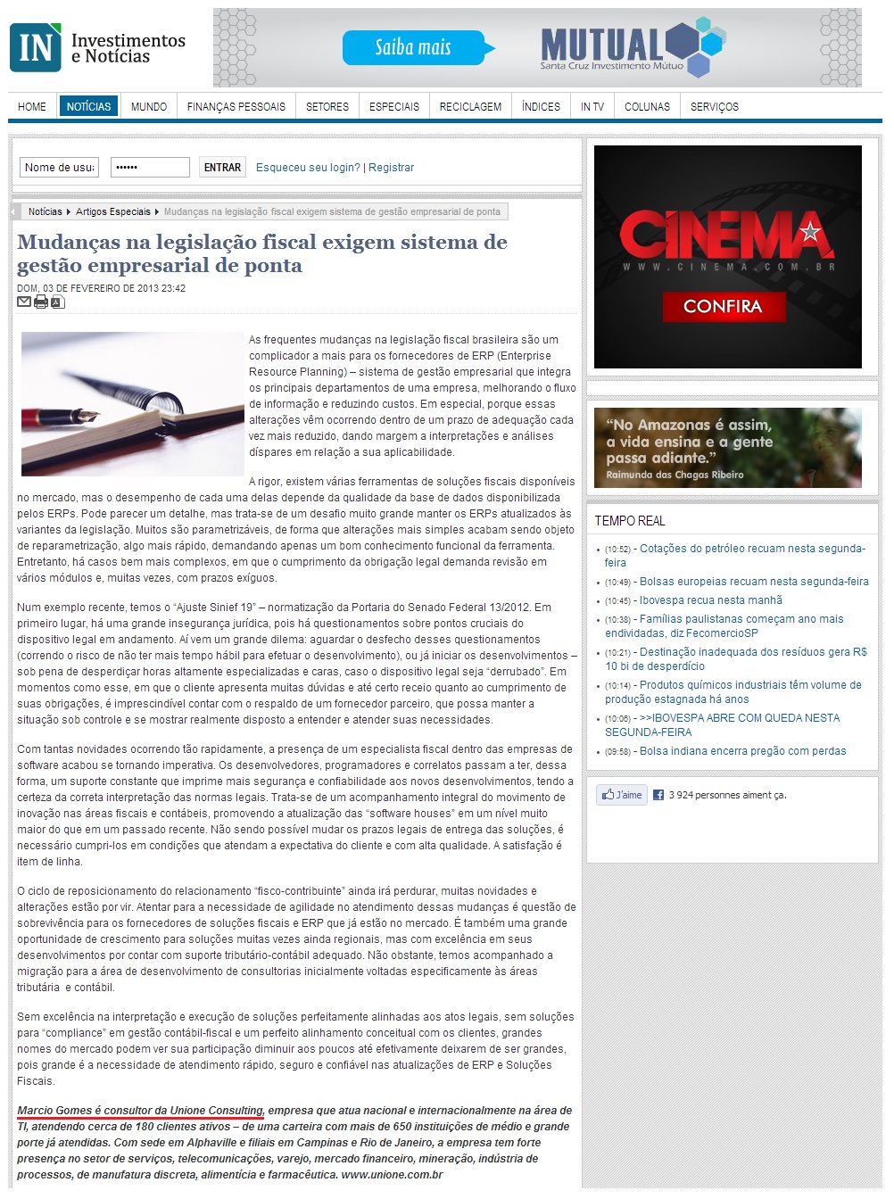 Clipping AGÊNCIA INVESTIMENTOS E NOTÍCIAS - Mudanças na legislação fiscal exigem sistema de gestão empresarial de ponta 04/02/2013
