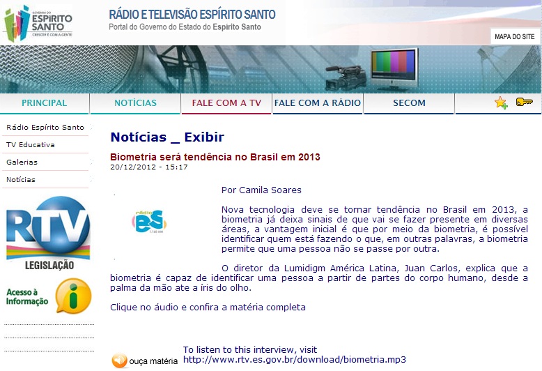 RÁDIO ESPÍRITO SANTO - Biometria será tendência no Brasil em 2013