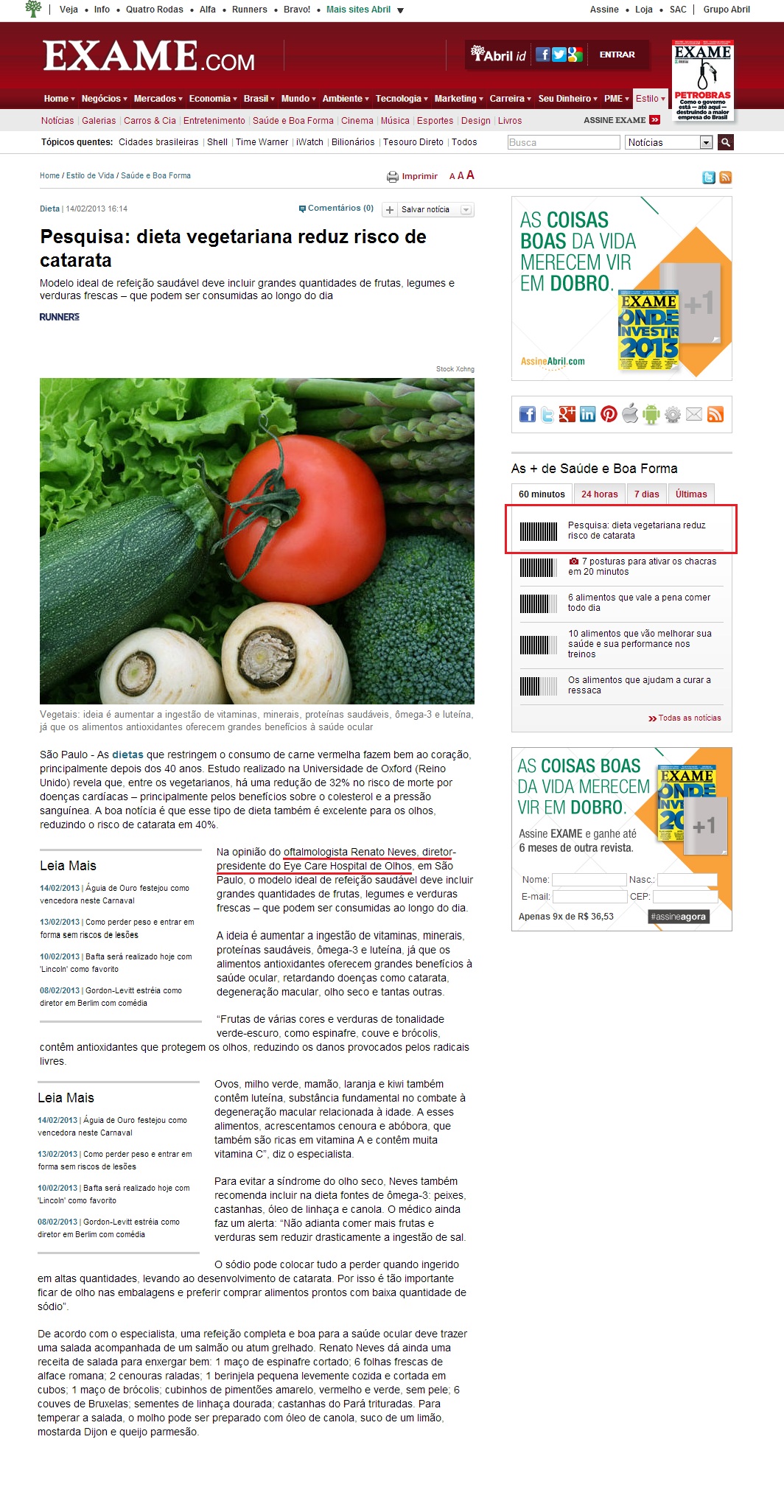 REVISTA EXAME (ONLINE) - Pesquisa: dieta vegetariana reduz risco de catarata