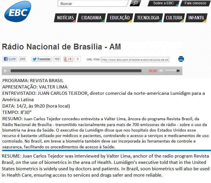 Clipping RÁDIO NACIONAL DE BRASÍLIA (PROGRAMA REVISTA BRASIL) - Biometria passa a autenticar profissionais de saúde e pacientes 19/02/2013