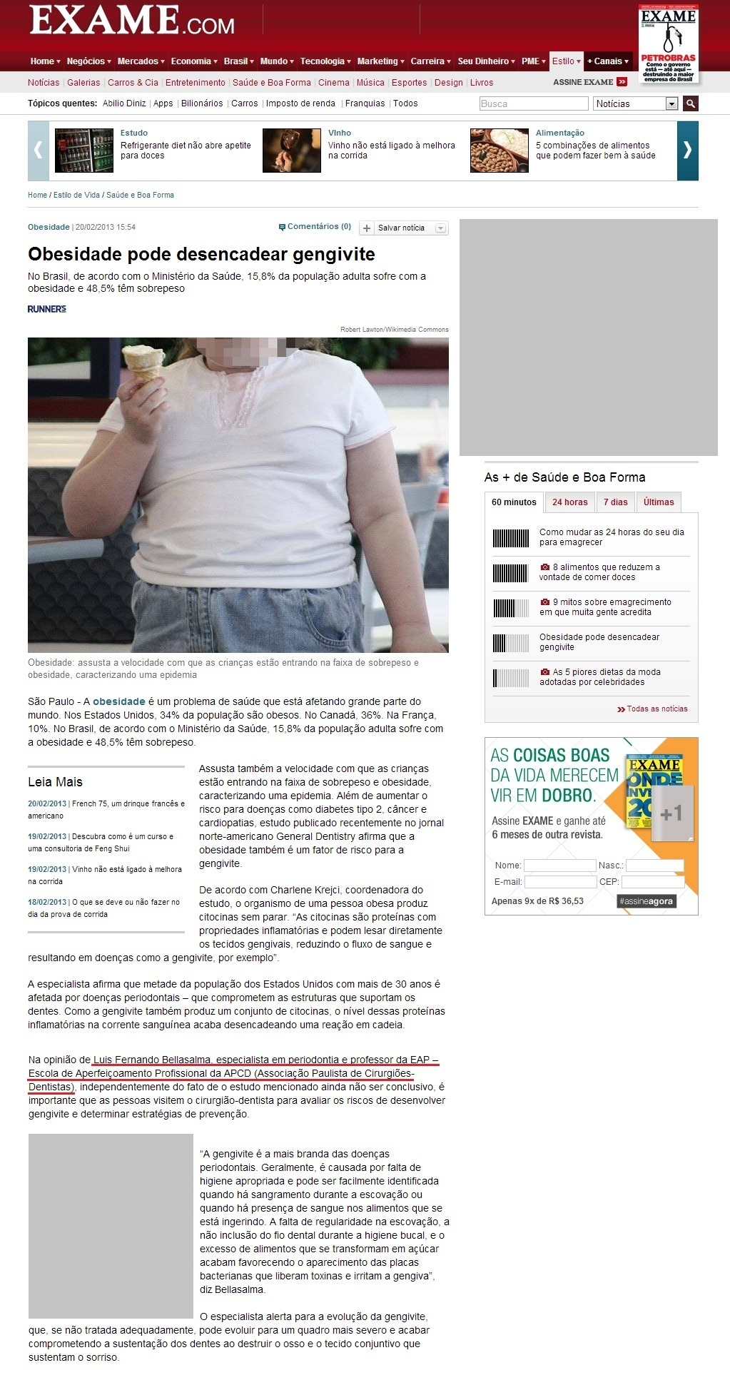 REVISTA EXAME (ONLINE) - Obesidade pode desencadear gengivite