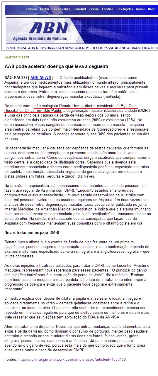 AGÊNCIA BRASILEIRA DE NOTÍCIAS - AAS pode acelerar doença que leva à cegueira