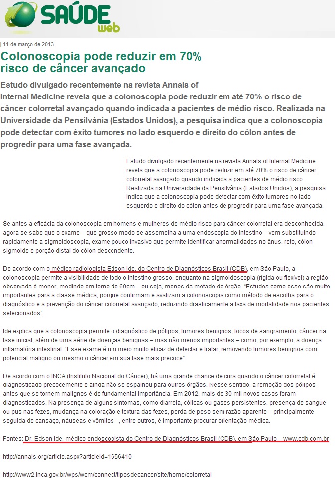 SAÚDEWEB - Colonoscopia pode reduzir em 70% risco de câncer avançado