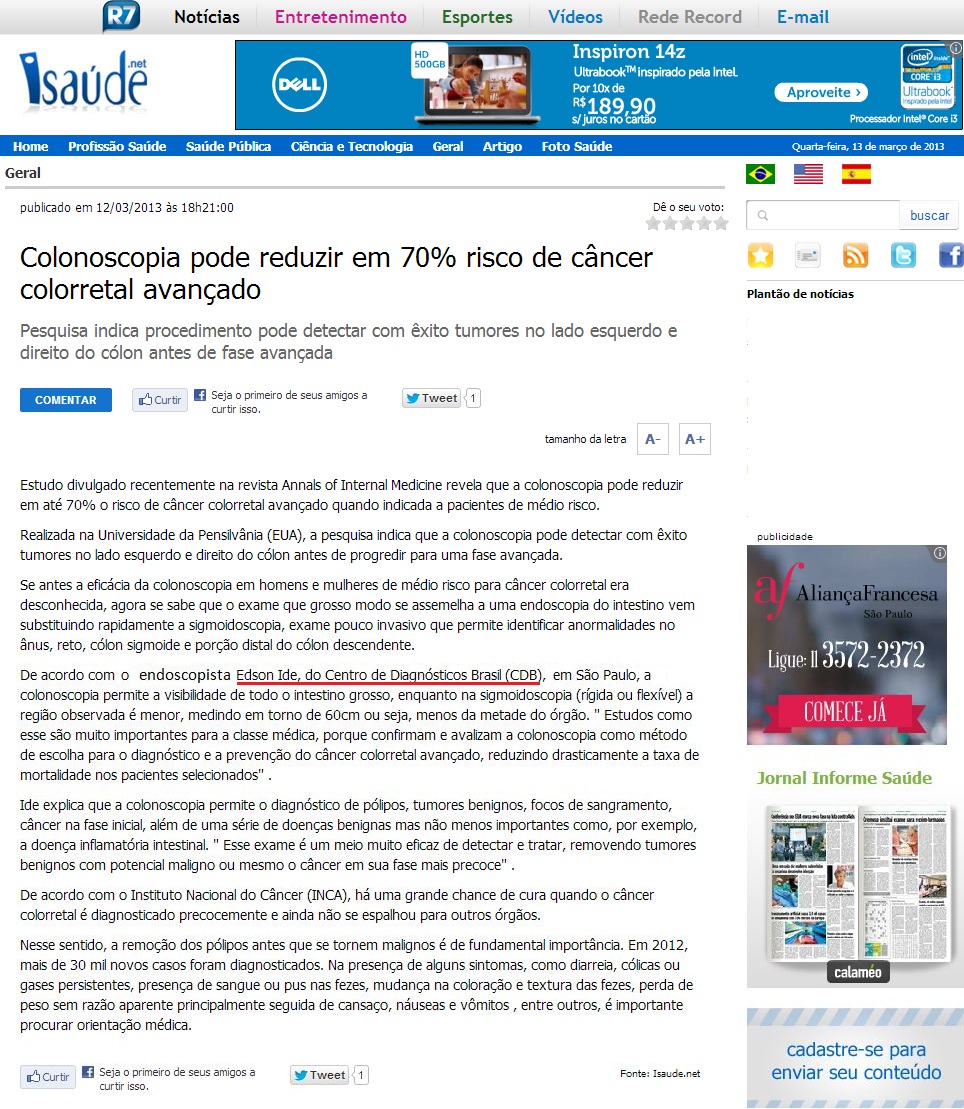 PORTAL R7 (iSAÚDE) - Colonoscopia pode reduzir em 70% risco de câncer avançado
