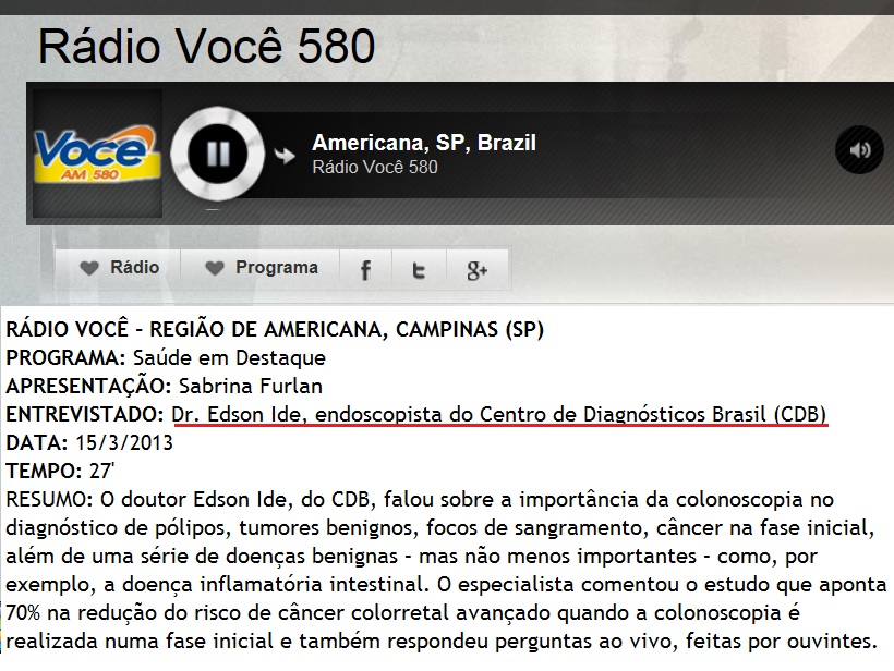 Clipping RÁDIO VOCÊ (CAMPINAS E REGIÃO) - Dr. Edson Ide fala sobre a importância da colonoscopia 15/03/2013
