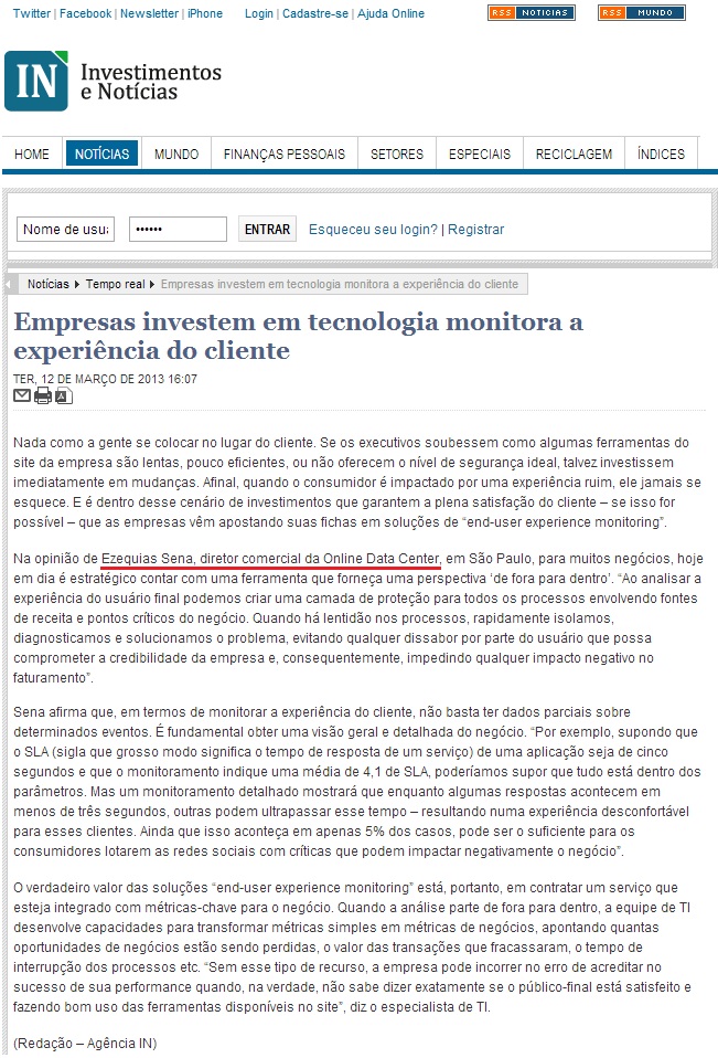 Clipping AGÊNCIA INVESTIMENTOS & NOTÍCIAS - Empresas investem em tecnologia que simula experiência do cliente 22/03/2013